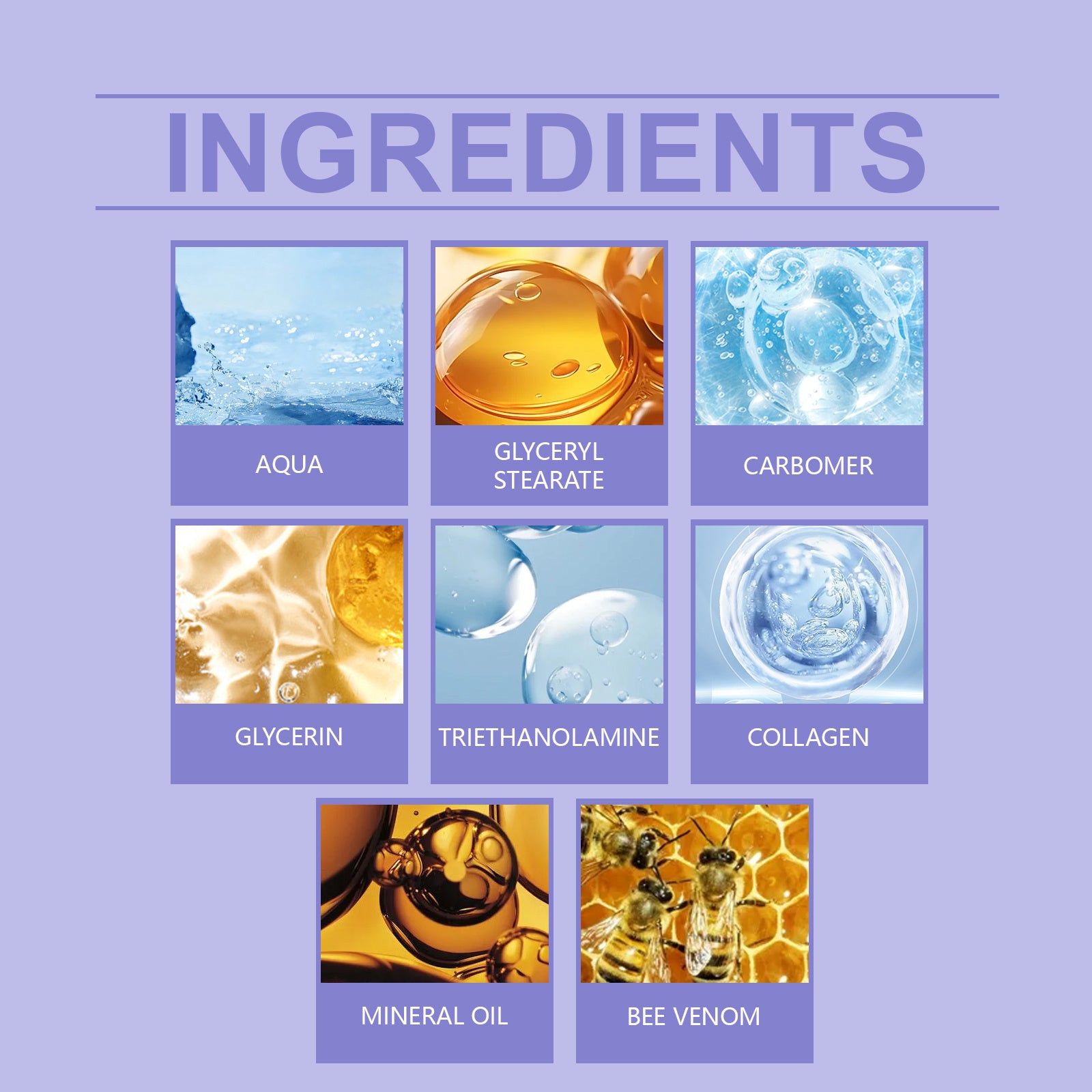 Ingredients: Triethanolamine, collagen, bee venom